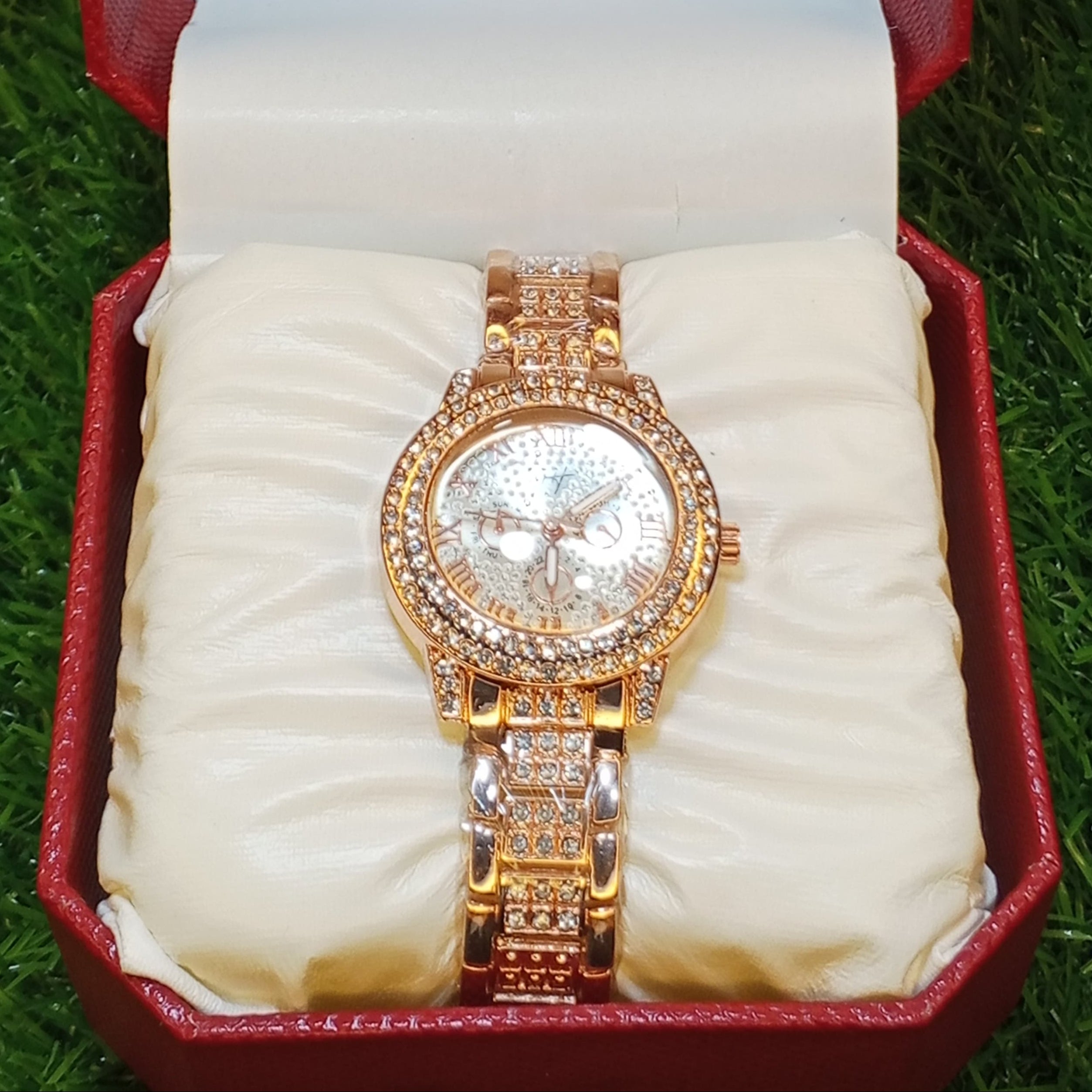 Crystal-Studded Bezel & Strap – Embedded with sparkling CZ diamonds for a luxurious shine